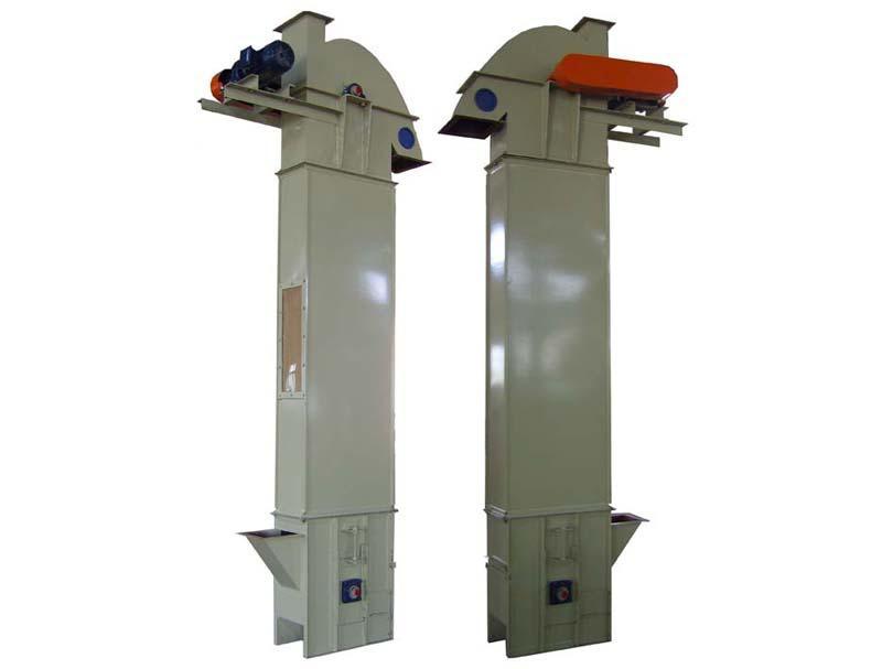 料斗把物料从下面的储藏中舀起,随着输送带提升到顶部,绕过顶轮后向下翻转, 斗式提升机将物料倾入接受槽内。带传动的斗式提升机的传动带一般采用橡胶带,装在下或上面的传动滚筒和上下面的改向滚筒上。链传动的斗式提升机一般装有两条平行的传动链,上或下面有一对传动链轮,下或上面是一对改向链轮。斗式提升机一般都装有机壳,以防止斗式提升机中粉尘飞扬。